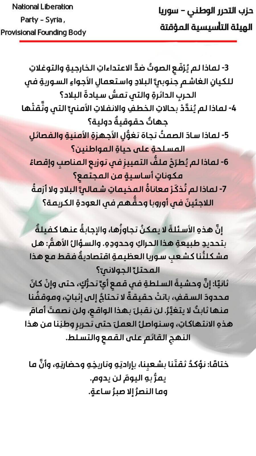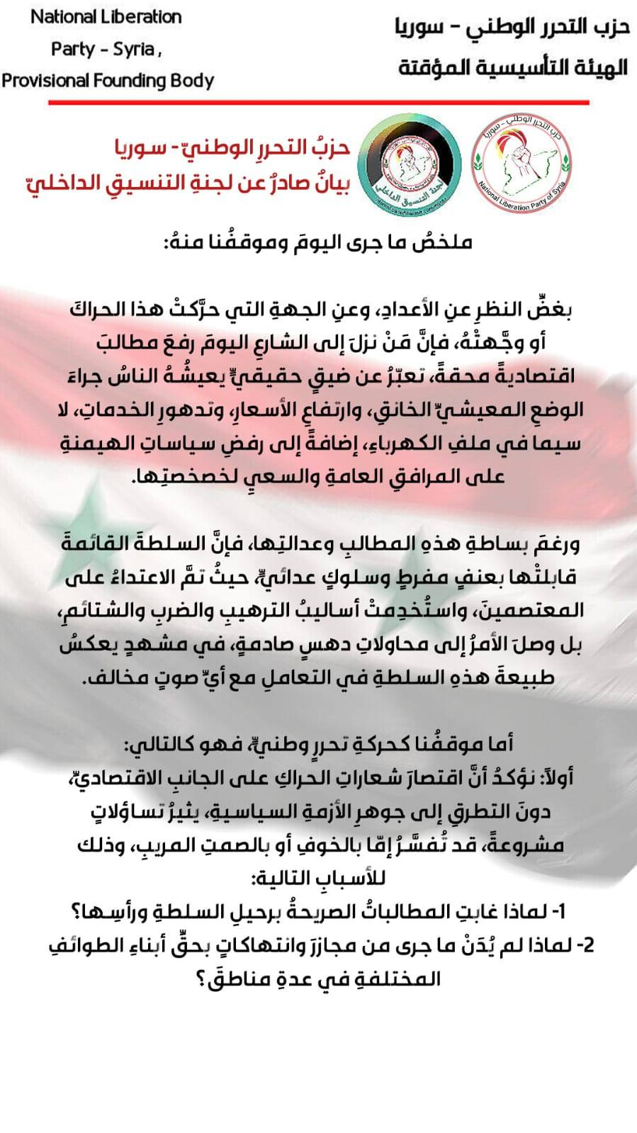 هنالك مجموعة من الاشخاص العقلاء وذوي الخبرة والاكاديميين الذين أراجعهم وأتداول معهم في الشأن السوري .. وهؤلاء لايظهرون على الشاشات بل تعرفهم من سنين التجربة .. وتدرك حصافتهم من خلال تشخيص دقيق للأحداث .. وقد لفت نظري بيان حزب التحرر الوطني الذي طرح تساؤلات هامة وملاحظات حقيقية منها: