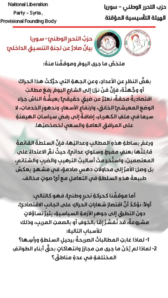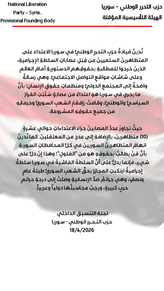 تُدينُ قيادةُ حزبِ التحررِ الوطنيِّ في سوريا الاعتداءَ على المتظاهرينَ السلميينَ من قِبلِ عصاباتِ السلطةِ الإجراميةِ، الذين خرجوا للمطالبةِ بحقوقِهم الدستوريةِ أمامَ العالمِ وعلى شاشاتِ مواقعِ التواصلِ الاجتماعيّ. وهي رسالةٌ واضحةٌ إلى المجتمعِ الدوليِّ ومنظماتِ حقوقِ الإنسانِ بأنَّ ما يجري في سوريا هو ارتهانٌ لعصابةٍ سلبت القرارَ السياسيَّ والوطنيَّ، وقامت بإفقارِ الشعبِ السوريِّ وحرمانِهِ من جميعِ حقوقِهِ المشروعةِ؛ حيث تجاوزَ عددُ المصابينَ جراءَ الاعتداءاتِ حوالي عشرةِ متظاهرينَ، بالإضافةِ إلى عددٍ من المعتقلين. إنَّ اتهامَ المتظاهرينَ السوريينَ في كلِّ المحافظاتِ السوريةِ بأنَّ مَن يُطالبُ بحقوقِهِ هو من “الفلولِ”، إنما يدلُّ على أنَّ السلطةَ الفاشيةَ في سوريا هي سلطةٌ إجراميةٌ ارتكبت المجازرَ بحقِّ الشعبِ السوريِّ طيلةَ عامٍ ونصفٍ؛ جرائمَ ضدَّ الإنسانيةِ وصلت إلى درجةِ جرائمِ حربٍ كبيرةٍ، ويجبُ محاسبتُها دولياً وعربياً.