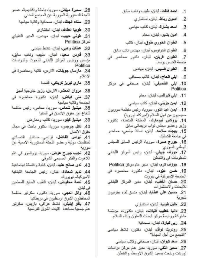ولكن لماذا توجد 30 شخصية لبنانية في هذه القائمة؟؟ ماهذا العداء لسوريةوشعبها من هذه الشخصيات المريضة العدوانية التي لاهمّ بها الا ايذاء الشعب السوري فقط من باب الكراهية المقيتة؟؟ .. ان الرسالة واضحة أن لبنان لن يكون الا وكرا وممرا للتآمر على سورية .. وأن استعادته من براثن هؤلاء الأشقياء مهمة لابد ان تكون على جدول اعمالنا جميعا ..