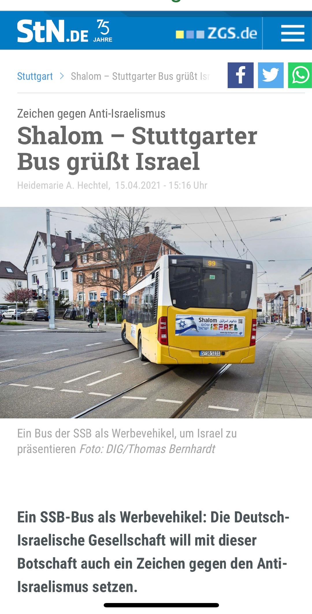 بإستخدام حافلة للركاب كوسيلة إعلانية سريعة الإنتشار في شتوتغارت لتحية إسرائيل باللغات الثلاثة العربية والعبرية والألمانية, لتلميع وجه الإحتلال، فقامت تلك الجمعية النزيهة بوضع لافتات تحمل علم إسرائيل.. وشالوم إسرائيل.. في خطوةٍ غير مسبوقة أثارت الكثير من المشاعر والذكريات الأليمة والآراء المتناقضة وطرحت علامات الاستفهام عن توقيت ومغزى هذه الخطوة الإستفزازية كما يراها الكثيرون هنا.. خاصةً ان الفكرة ستتمدَّد بالتأكيد الى وسائل نقل متعددة في المدينة وربما ستُصيبُ تلك العدوى مدن المانية واوروبية اخرى وتقوم بتنفيذ تلك الفكرة التي خرقت قانون متعارفٍ عيه بعدم الترويج او تقديم الاعلانات الأيدلوجية السياسية او الدينية او غير اخلاقية على وسائل النقل الرسمية وأخواتها!!!.