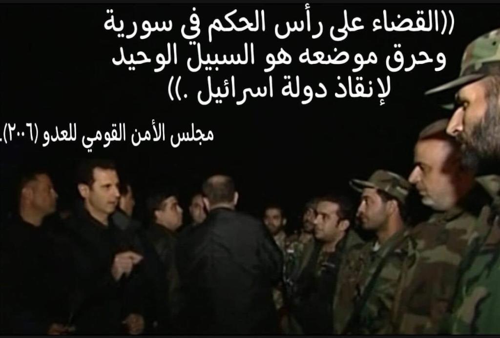و لكي لاينسى البعض أنه يواجه حربا من طراز الفناء لنقرأ ماقاله مجلس الأمن القومي للعدو الصهيوني وهو الآتي :إن القضاء على رأس الحكم في سورية وحرق موضعه هو السبيل الوحيد لإنقاذ دولة اسرائيل ) .