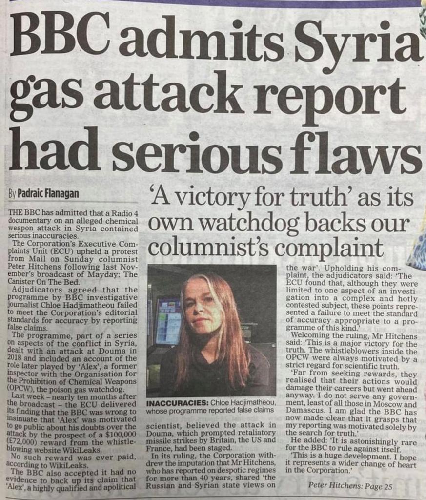 نحن نعلم ان كل ماقالته البي بي سي وجميع الاعلام العالمي والعربي والاسلامي عن سورية كان كذبا وسردا للأساطير .. بل ان نشرات الاخبار كانت تشبه حكايات الميثولوجيا الاغريقية التي لاتصدق حيث تبدو الحكومة السورية مثل آلهة الشر الغاضبة التي لاتهوى الا قصف المشافي ودور العجزة ودور الحضانة والمدارس ويبدو الجيش السوري مثل اله الليل والعواصف والحرائق الذي لايتعشى الا بوجبات من أشلاء الاطفال فقط .. وان توابله هي الاسلحة الكيماوية ..