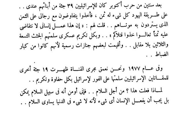 ( لماذا لم يقل لنا السادات ما كان ينوى فعله ؟ ربما لو أبلغنا مسبقا لكنا قدمنا له شيئا فى المقابل ؟ فى السياسة كما فى كل شئ أخر ، فأن لا أحد مستعد لدفع ثمن لشئ حصل عليه بالفعل).