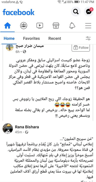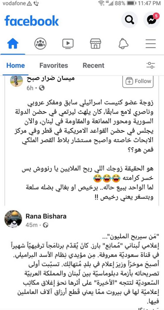 كنت أظن ان احدا سيترك هذه الجاسوسة تلقي حمولتها التجسسية والفتنوية وتمضي في سبيلها .. التي انفطر قلبها على العمال اللبنانيين الذين سيخسرون اعمالهم .. ولكن قلبها لم ينبس ببنت نبضة ازاء ملايين الفقراء السوريين المحاصرين من قطر والسعودية وتركيا والعرب واوروبة والذين تمنع عنهم اميريكا النفط رغم ان قطر والسعوزدية يمكنهم ان يجعلوا النفط أنهارا ..