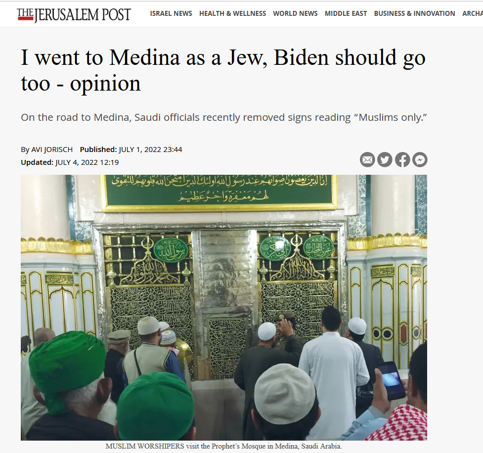الاسرائيليون اليوم وصلت طلائعهم الى السعودية .. واقتربوا من المرقد النبوي الشريف .. وهم يحومون حوله .. فقد دعا صحفي يهودي وعضو بارز في مجلس السياسة الخارجية الامريكي عبر صحيفة حيوزاليم بوست دعا الرئيس الامريكي بايدن الى زيارة المسجد النبوي في المدينة المنورة ابان زيارته المرتقبة الى السعودية ليبني جسورا من التواصل مع العالم الاسلامي .. وقد عبر الصحفي اليهودي عن بهجته من اقار الغاء المنع السابق لغير المسلمين من دخول المدينة بل وأزيلت العلامات التحذيرية على الطريق التي كانت قبل ذلك .. والاكثر من هذا ان 50 مستثمرا يهوديا من 13 دولة مختلفة ولكن بارتباطات وثيقة باسرائيل قد زاروا بانفسهم المسجد النبوي بالمدينة الشهر الماضي في زيارة لتعزيز الفهم المشترك واحترام التسامح الديني كما قال (طبعا التسامح الديني مطلوب منا اما في المسجد الاقصى فمطلوب من المسلمين التنازل الديني حيث لاتسامح يهوديا مع الاقصى والقدس) ..