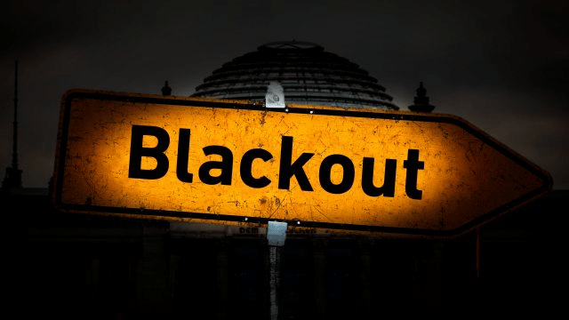 في الصورة البائسة، علامة صفراء عليها نقش “تعتيم” ، مضاءة بواسطة مخروط من الضوء أمام مبنى الرايشتاغ الالماني المظلم في برلين في سابقة فريدة لم نشاهدها في الثلاثة عقود الماضية على الاقل !!