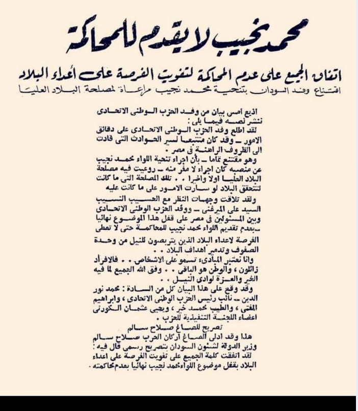 محمد نجيب عندما زار السودان بعد ثورة 1952 هاجمه السودانيون بالأحذية وهتفوا فى وجهه : لا مصري ولا بريطانى .. السودان للسودانى.