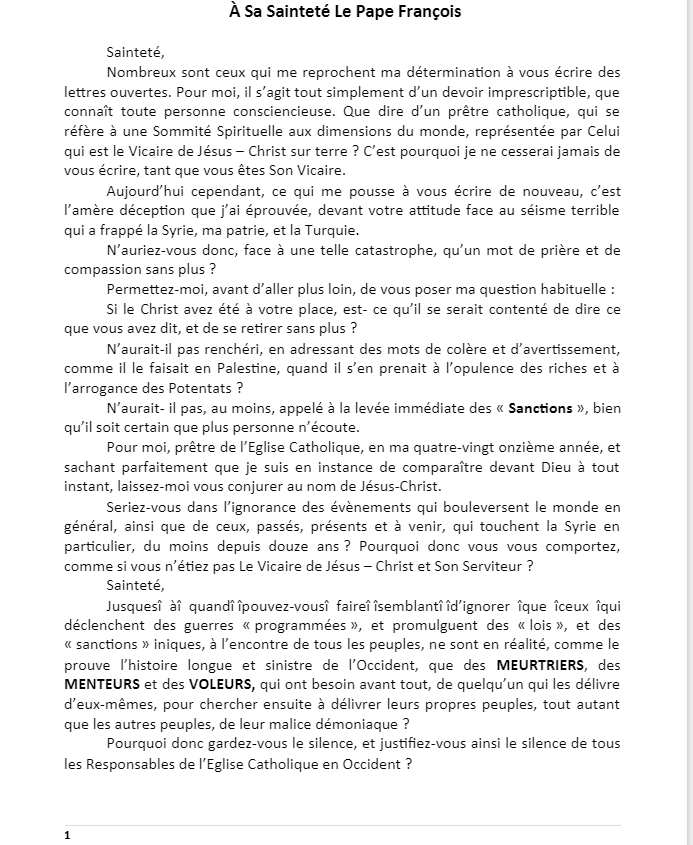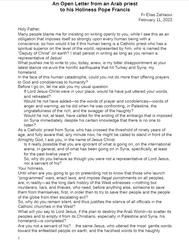 رسالة شديدة اللهجة من كاهن عربي سوري الأب الياس زحلاوي الى قداسة البابا فرنسيس وهذا نصّها.