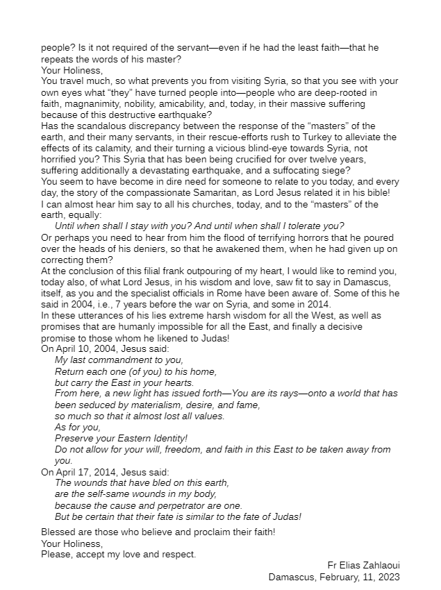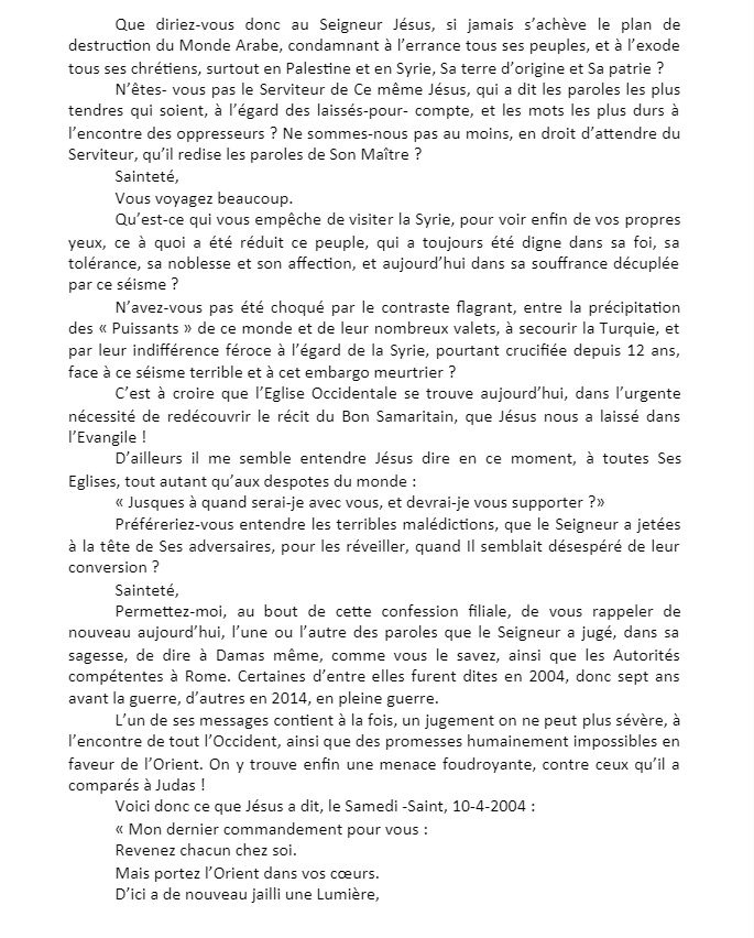 إلاّ أني، يا صاحب القداسة، أؤثر، في ختام هذه المصارحة البنويّة، أن أذكّرَك، اليوم أيضاً، ببعض ما ارتأى الربّ يسوع، في حكمته ومحبّته، أن يقولَه في دمشق بالذات، كما تَبيّنَ لكَ وللمراجع المختصّة في روما. فمنه ما قاله عام 2004، أي قبل الحرب على سورية بسبع سنوات، ومنه ما قاله خلالها، عام 2014.