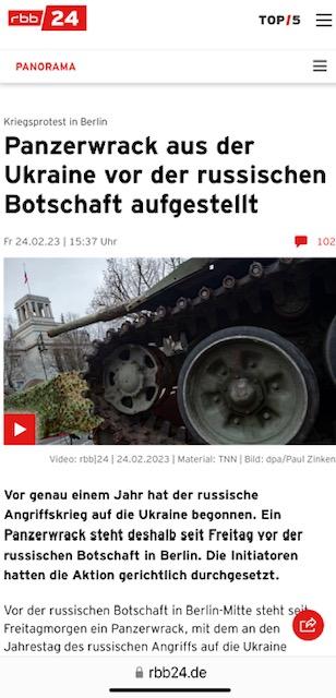 قبل عام بالضبط ، بدأت العمليات العسكرية الروسية في أوكرانيا. لذلك سنرى على مدار الساعة تلك الدبابة المحطمة أمام السفارة الروسية في برلين تحرسها رجال الامن أيضاً على مدار الساعة !!. اللافت ان هذه الخطوة الهجينة المستهجنة والقائمون عليها قد حصلوا على إذنٍ مُسبق من المحكمة لتنفيذ هذه الوقفة الاحتجاجية المُستفزَّة لإحياء ذكرى الهجوم الروسي على أوكرانيا حسب تعبيرهم !!. ويقال إن الدبابة الروسية T-72 المدمرة سوف تقف أمام مبنى Unter Den Linden لبضعة أيام كنصب تذكاري ضد الحرب.!!