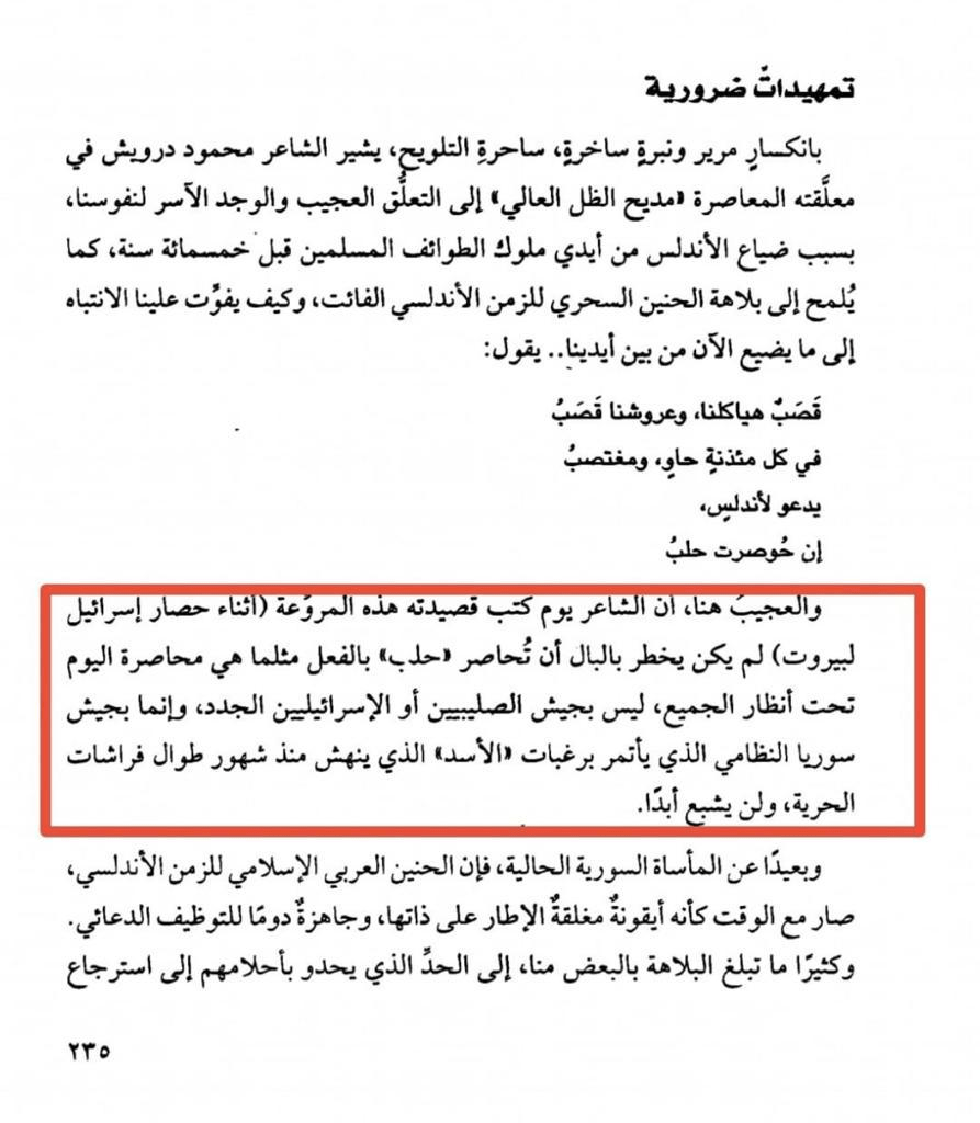وكان تعليق يوسف زيدان هو التالي: العجيب ان الشاعر يوم كتب قصيدته المروعة أثناء حصار بيروت ..لم يكن يخطر بالبال ان تحاصر حلب بالفعل .. مثلما هي محاصرة اليوم تحت أنظار الجميع .. ليس بجيش الصليبيين او الاسرائيليين الجدد .. وانما بجيش سورية النظامي .. الذي يأتمر لرغبات (الأسد) الذي ينهش منذ شهور طوال فراشات الحرية .. ولن يشبع أبدا..