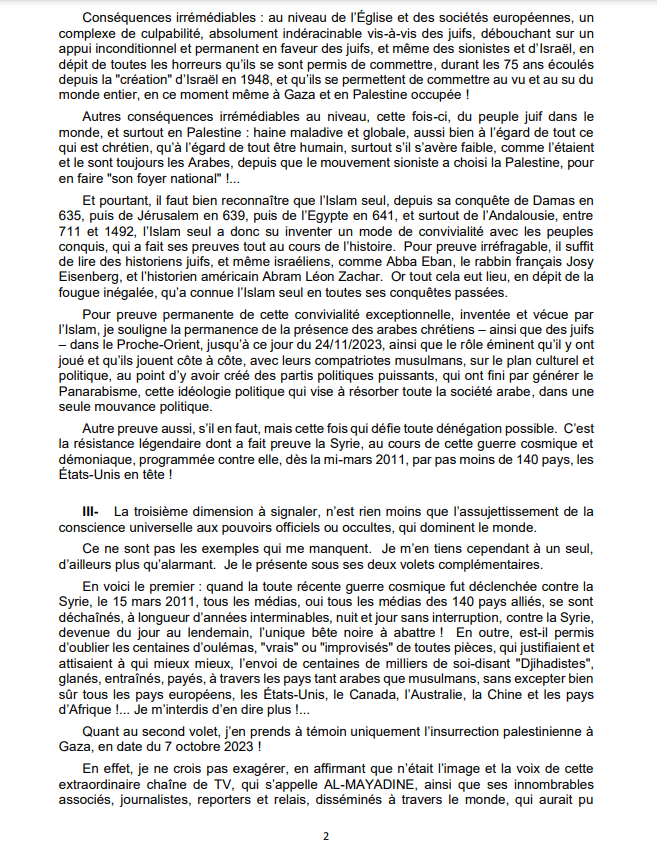 وأصل الآن إلى ما يبدو لي الانهيار المطلق لكل تعايش ممكن بين جميع الديانات من جهة، ولا سيما المسيحية واليهودية، وجميع الدول من جهة أخرى، باستثناء بعض الفترات، كما حدث في عهد الأمويين، والعباسيين، ولا سيما في الأندلس، طوال القرون الماضية، وخلال فترة حديثة نسبياً، في لبنان وسورية… وإن مثل هذا التأكيد، لا يستند البتّة إلى أي تضخيم أو تجاهل لوقائع التاريخ.