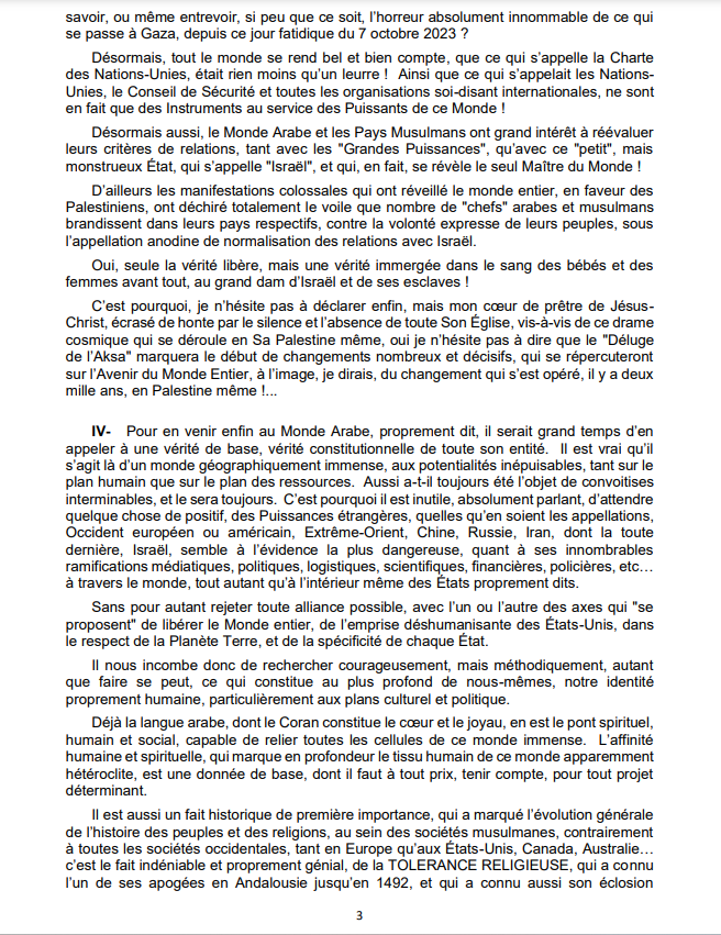 ولذلك، فإني لا أتردّد البتة في الإعلان أخيراً، ولكن بما لدي من قلب كاهن مؤمن بيسوع المسيح، وقد سُحِق خجلاً بسبب صمت الكنيسة كلّها وتغيّبها عن هذه المأساة الكونية التي تجري أحداثها في فلسطين، وطنه بعينه، أجل لا أتردّد في الإعلان أنّ “طوفان الأقصى” سوف يسجّل بداية تبدّلات كثيرة وحاسمة، ستترجّع أصداؤها على نطاق مستقبل العالم بأسره، في ما يشبه التبدّلات التي حدثت قبل ألفي عام، في فلسطين بالذات.