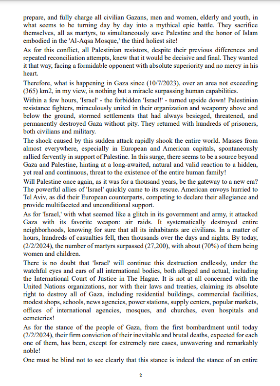 ذلك بأنّه هو وحده، كما أرى، استطاع، على نحو خفيّ، ولكن عميق وبالغ العظمة، أن يُلهم، ويُحرِّض، ويُعِدّ، ويشحن على نحوٍ كلّيّ، جميع الغزّاويّين المدنيّين أيضاً، من رجال ونساء، ومن كبار السنّ وشبّان وأطفال، في سبيل معركة لن يكونوا فيها كلّهم، سوى شهداء، كي ينقذوا في آن واحد، فلسطين وكرامة الإسلام، المتمثّلة في “المسجد الأقصى”، ثالث الحرمين الشريفين! وأمّا هذا النزاع، فقد كان جميع المقاومين الفلسطينيّين، من جهتهم – بعد أن كانوا حتى اللحظة، على خلاف كلّيّ، على الرغم من جميع هزائمهم الماضية، ومحاولات المصالحة المتكرّرة! – يعرفون أنّه سيكون حاسماً ونهائيّاً، وقد أرادوه كذلك، في مواجهة خصمٍ مقتدر، يتمتّع بتفوّق كلّيّ، ولا تعرف الرحمةُ إلى قلبه سبيلاً.