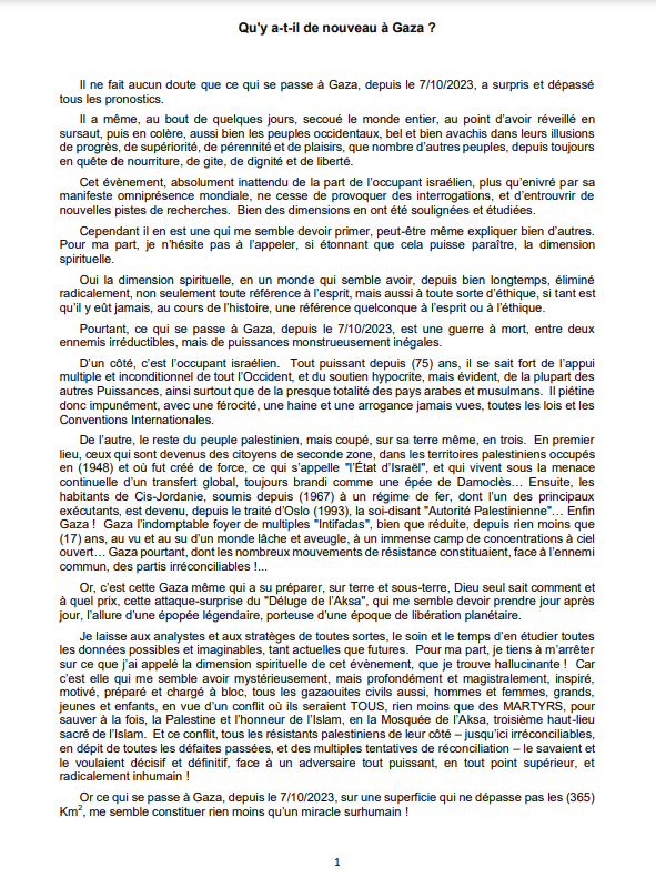 أجل، لا بدّ للمرء من أن يكون أعمى أو… غبيّاً، كي لا يتّضح له، إزاء مثل هذه الاستعدادات الفريدة بالمطلق، في حوليّات الحروب، أنّه حقّاً أمام شعب برمّته شاء بكلّ ما في الكلمة من معنى، أن يشرّف وجوده بالاستشهاد في سبيل قضيّة مزدوجة وموحّدة: الله وفلسطين!