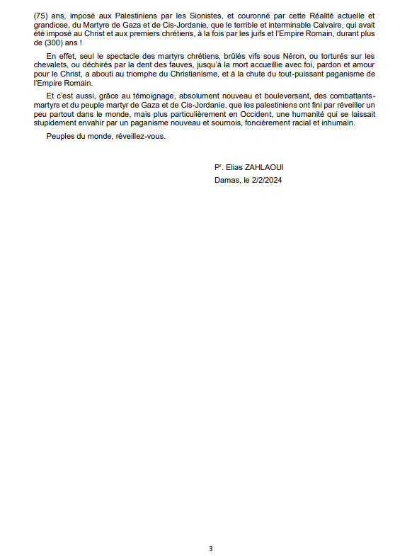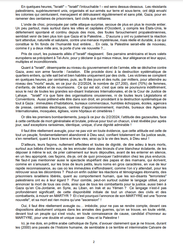 وهنا، أجدني مضطرّاً للاعتراف الصريح، بوصفي كاهناً عربيّاً كاثوليكيّاً من سورية، أنّني، إذ أستعرض الألفيّتَيْن الماضيتَيْن من التاريخ البشريّ، لا أقف عند ما يماثل درب الآلام، الرهيب والطويل، الذي فُرِض على الشعب الفلسطينيّ على يد الصهاينة، منذ (75) سنة، والذي يتوّج اليوم بهذا الواقع الراهن، سوى درب الآلام الرهيب والطويل الذي كان قد فرضه على السيّد المسيح والمسيحيّين الأوّلين، طوال أكثر من (300) سنة، اليهود والإمبراطوريّة الرومانيّة!