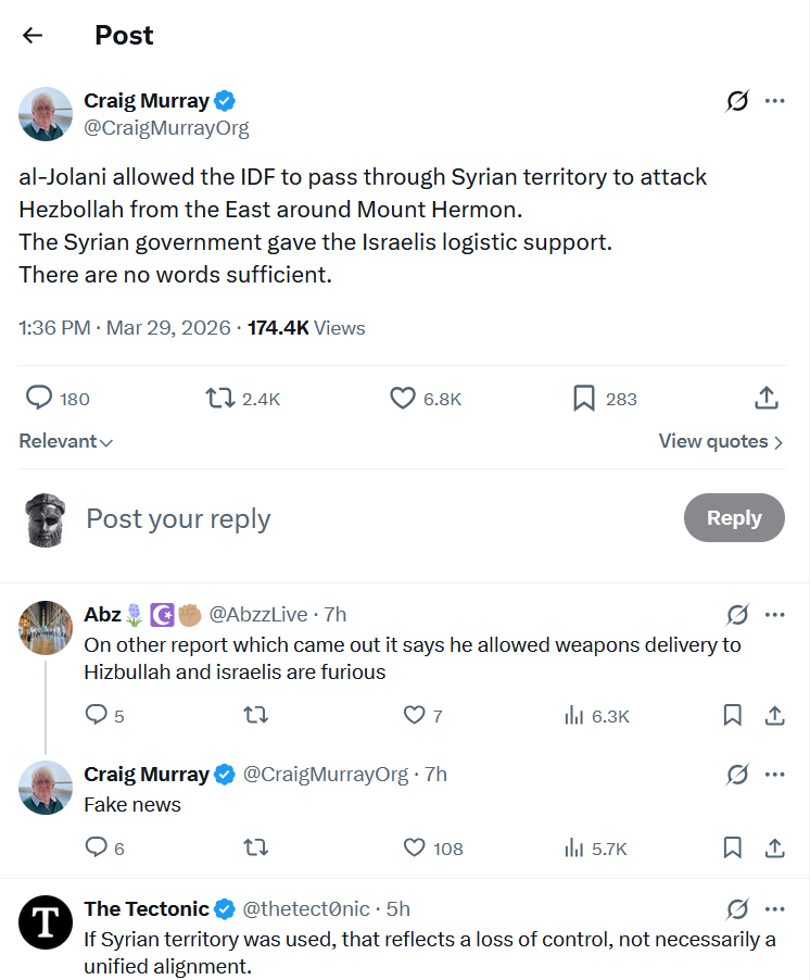 السفير والاكاديمي البريطاني كريغ موري يفضح الجولاني ويقول ان الكلامت تحار في وصف مايفعله هذا الرجل: “الجولاني سمح للجيش الاسرائيلي بالعبور من الاراضي السورية لمهاجمة حزب الله من الشرق وجبال حرمون.. والحكومة السورية أعطت الدعم اللوجستي للجيش الاسرائيلي” .. الجاسوس الموسادي يقوم بعمله على أكمل وجه