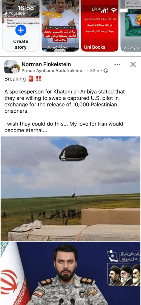 فيما نقل عن المفكر والباحث اليهودي المناهض للصهيونية انه يتمنى ان ينفذ الاميريكون صفقة التبادل التي ربما سيقترحها الايرانيون بأن اطلاق سراح الطيار الاميريكي اذا وقع في الأسر في صفقة تبادل ممكن اذا أطلقت اسرائيل سراح 10 آلاف فلسطيني ..
