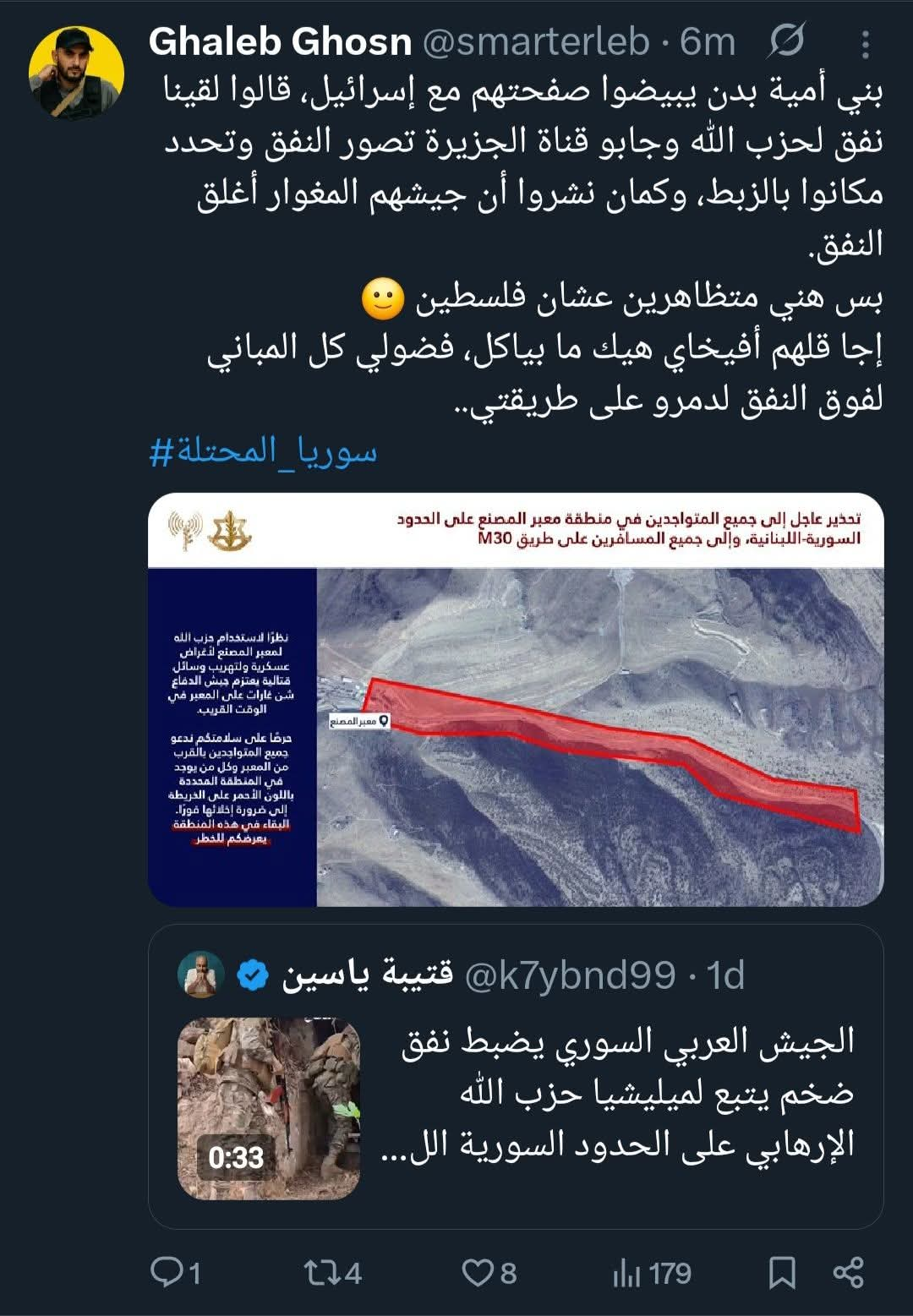 فيما تنفخ الاخبار في قصة التظاهرات المؤيدة لفلسطين التي يقيمها الامويون الجدد نفاقا .. فان الامويين يعملون مع خبراء اسرائيليين لكشف أنفاق حزب الله التي تصله بسورية .. وهو نوع من الجهاد العبري للأمويين .. دعما لفلسطين طبعا .. لأن حزب الله عدو فلسطين .. وايران عدو فلسطين .. وفقط هم الامويون أنصار فلسطين .. وسيصلون القدس بأذن الله ..