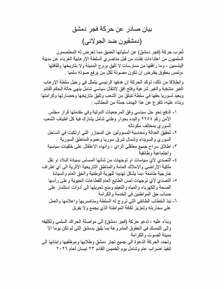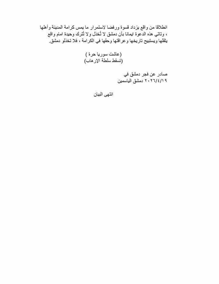 دمشق تغلي وتتحرك: بيان ثان صادر عن حركة فجر دمشق (دمشقيون ضد الجولاني) – متى تنتفض دمشق؟؟