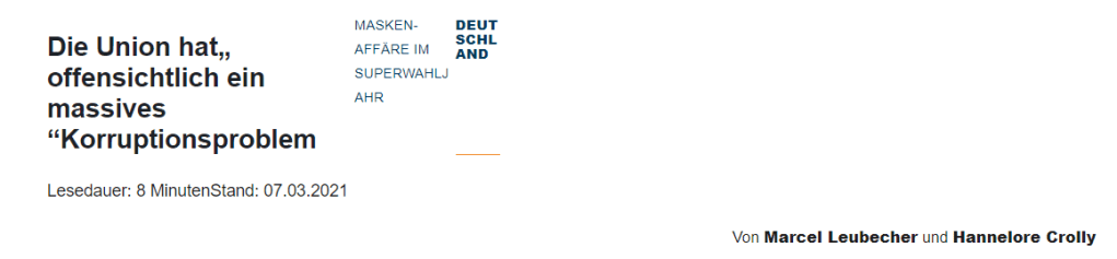ُيقال إن العديد من أعضاء البوندستاغ حصلوا على أموال من القطاع الخاص عند إبرام صفقات لشراء أقنعة واقية من كورونا!! ” والله أعلم” وهي كارثة سياسبة وأخلاقية للاتحاد الحاكم في هذه السنة الانتخابية الكبرى قبيل الانتخابات هذا العام، الذي دفع المعارضة للهجوم والإكتساح الناقد بالفعل.