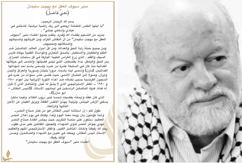 ترجّل الفارس عن صهوة حصانه وعاد السّيف إلى غمده بعد أكثر من نصف قرن كان مسلّطا على كل شر وعلى كل ظالم ٍ وعدو ،، ترجّلت بهجة قلوبنا حدادا واكبارا لروح من كانت روحه معنا وبيننا تُربّت على هذا وتُنصف ذاك ،