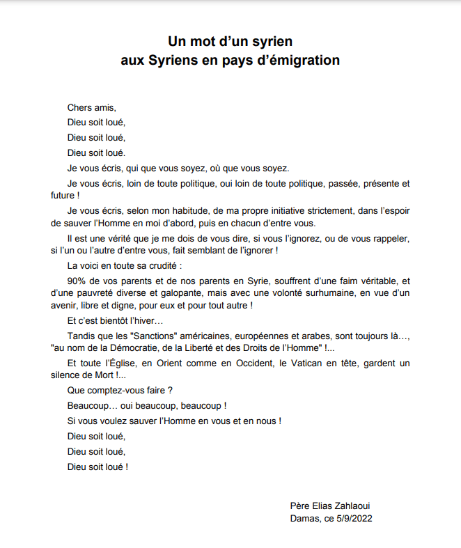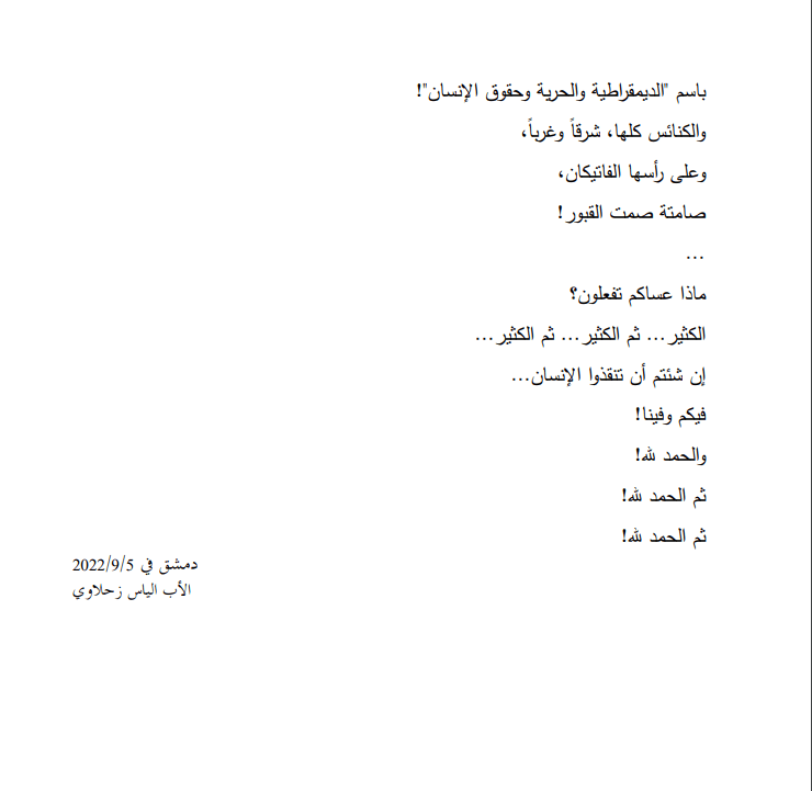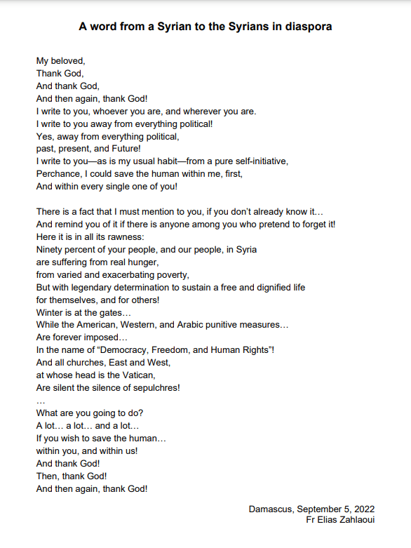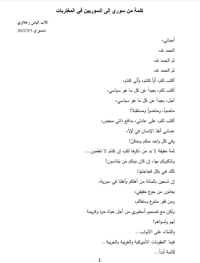 أيها الناس .. وياايها الوطنيون .. وياأيها السوريون .. اسمعوا وعوا .. هذه الكلمات وهذا النداء الذي أطلقه الأب الياس زحلاوي من قلبه وحط في قلوبنا جميعا: .مايقوله الاب الياس زحلاوي